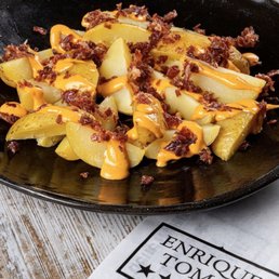 The atmosphere at Enrique Tomas is perfect for a date night or girls' night out, with excellent service and reasonably priced drinks. The menu includes a noodle version of paella called fideua, which some customers have found to be Asian-inspired and over-saturated with soy sauce.